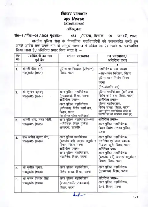 पटना: बिहार सरकार ने नए साल के आठवें दिन बड़ा प्रशासनिक फेरबदल करते हुए 22 IAS और 71 IPS अधिकारियों का तबादला कर दिया है। इसके साथ ही 10 DSP और 11 बिहार प्रशासनिक सेवा के अधिकारियों की भी ट्रांसफर-पोस्टिंग की गई है। सामान्य प्रशासन विभाग ने इससे संबंधित अधिसूचना जारी कर दी है।