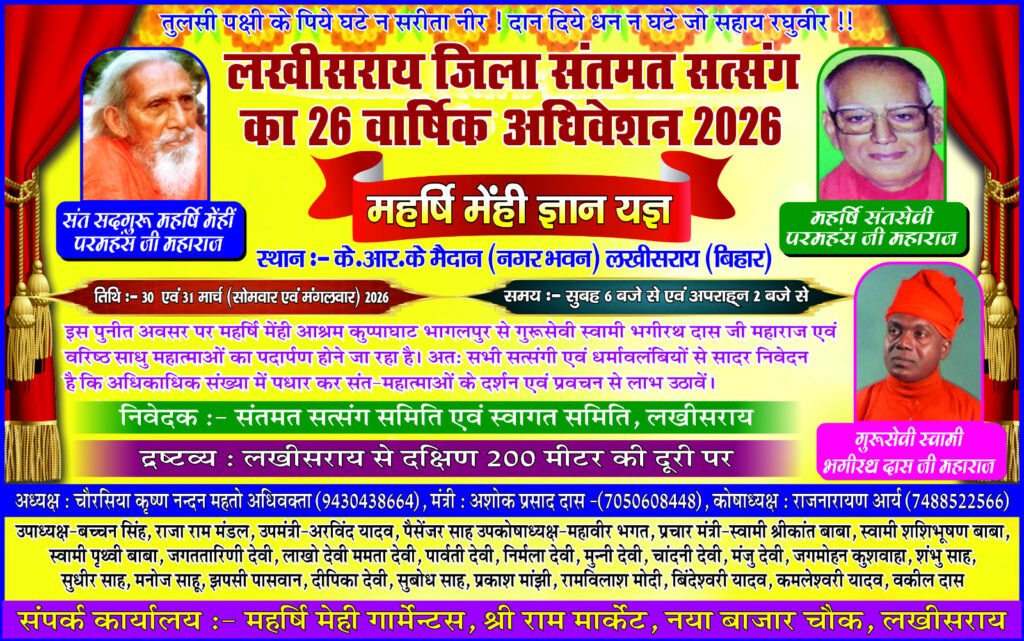 लखीसराय: जिले में आध्यात्मिक माहौल बनने जा रहा है। महर्षि मेंहीं परमहंस जी महाराज की शिक्षाओं पर आधारित संतमत सत्संग का 26वां वार्षिक अधिवेशन 30 और 31 मार्च 2026 को आयोजित होगा। यह दो दिवसीय कार्यक्रम के.आर.के मैदान (नगर भवन) में आयोजित किया जाएगा, जहां सुबह 6 बजे और दोपहर 2 बजे से ज्ञान यज्ञ और प्रवचन होंगे।