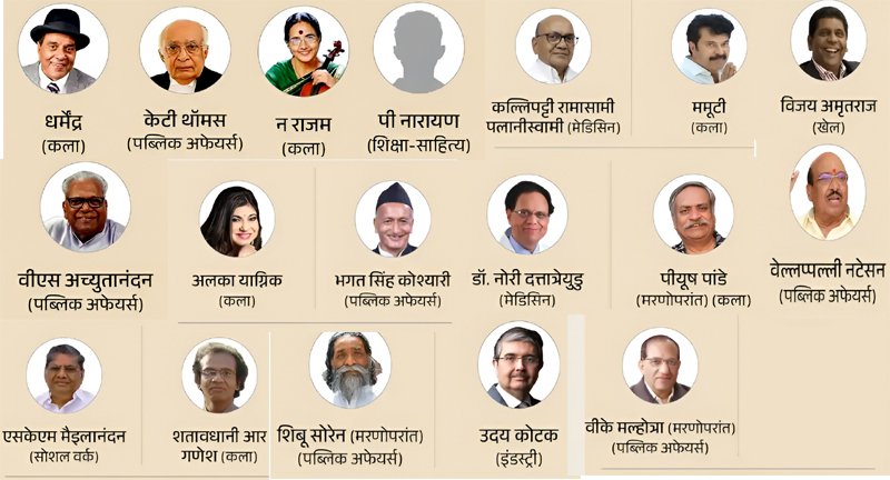 पद्म विभूषण के लिए दिवंगत अभिनेता धर्मेंद्र के नाम की घोषणा की गई है। उनके साथ सुप्रीम कोर्ट के पूर्व न्यायाधीश के.टी. थॉमस, केरल के पूर्व मुख्यमंत्री वी.एस. अच्युतानंदन सहित अन्य हस्तियां भी इस सर्वोच्च नागरिक सम्मान से नवाजी जाएंगी। पद्म भूषण पुरस्कार पाने वालों में झारखंड के पूर्व मुख्यमंत्री दिवंगत शिबू सोरेन और मशहूर गायिका अलका याग्निक प्रमुख हैं।