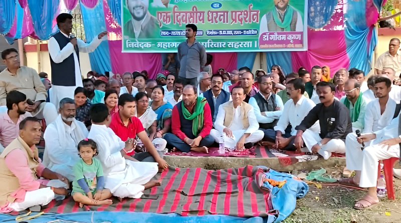 सहरसा: बेमौसम बारिश और आंधी-तूफान से मक्का और गेहूं की फसल को भारी नुकसान होने के बाद किसानों का गुस्सा सड़कों पर नजर आया। महागठबंधन के बैनर तले सहरसा स्टेडियम परिसर के बाहर एकदिवसीय धरना-प्रदर्शन आयोजित किया गया, जिसमें बड़ी संख्या में किसान, नेता और कार्यकर्ता शामिल हुए।