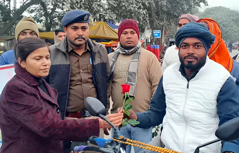 शेखपुरा जिले में सड़क सुरक्षा माह के तहत जिला परिवहन विभाग ने बुधवार को एक अनोखा जागरूकता अभियान चलाया। यह अभियान जिला मुख्यालय के कचहरी रोड से चांदनी चौक तक संचालित किया गया, जहां बिना हेलमेट बाइक चला रहे चालकों को दंडित करने के बजाय गुलाब का फूल देकर यातायात नियमों के प्रति जागरूक किया गया।