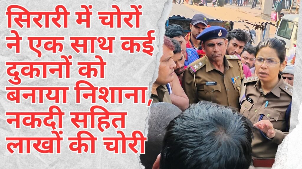 सिरारी चौक स्थित मित्र मार्केट में रौशन कुमार के दवा दुकान एवं तेल मिल से 1 लाख 19 हज़ार रुपये नकदी व अन्य सामानों सहित उधार की बही को भी चोरी कर लिया। वहीं, इसी मार्केट में पंकज कुमार शर्मा के जेनरल स्टोर और रावा दुकान से 50 हज़ार नकदी सहित डेढ़ लाख रुपए का हॉर्लिक्स सहित अन्य कीमती सामान की चोरी कर लिया। इस दौरान चोरों ने बगल के ही महारानी मार्केट में अवस्थित भूपेंद्र प्रसाद सिंह के अंडा दुकान से 1 लाख 13 हज़ार रुपए नकदी की चोरी कर लिया है। ये होलसेल अंडा का बिक्रेता है। घटना के बाद स्थानीय लोगों में दहशत व्याप्त है।