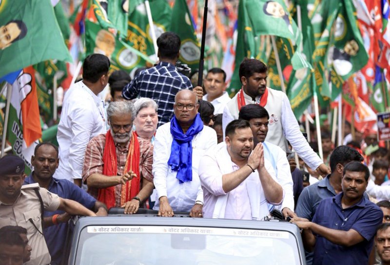 शेखपुरा। वोटर अधिकार यात्रा के तहत बुधवार को नेता प्रतिपक्ष तेजस्वी यादव, मुकेश साहनी और सीपीआई के राष्ट्रीय महासचिव दीपांकर भट्टाचार्य शेखपुरा पहुंचे। इस दौरान नेताओं ने चुनाव आयोग और सरकार पर जमकर हमला बोला।